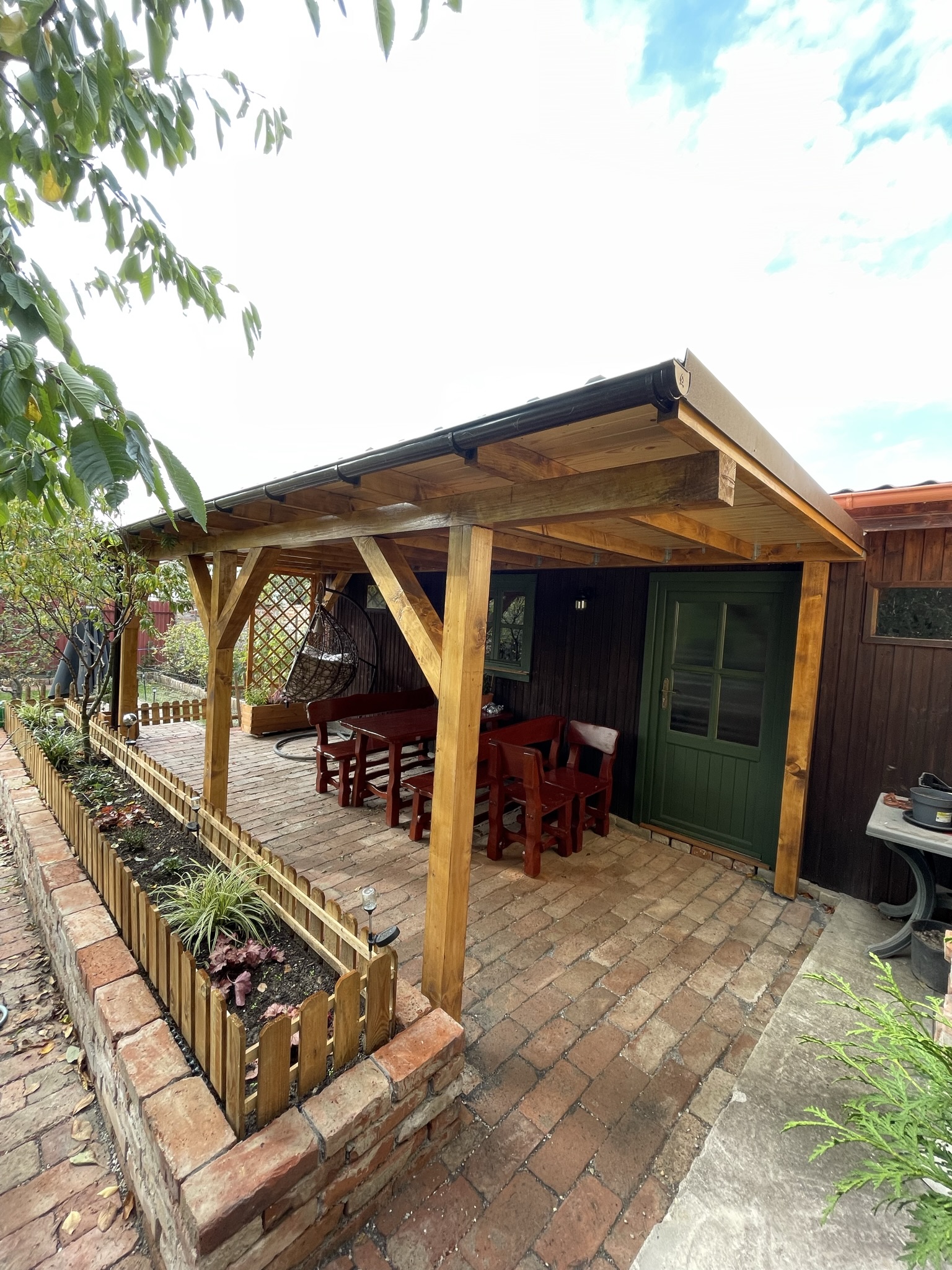 Given the limited space and the style of the remaining part of the garden, we chose a wooden canopy over the terrace.