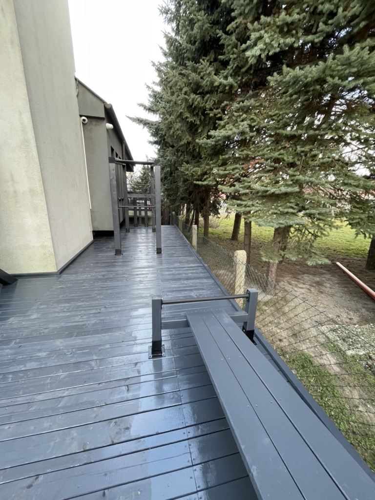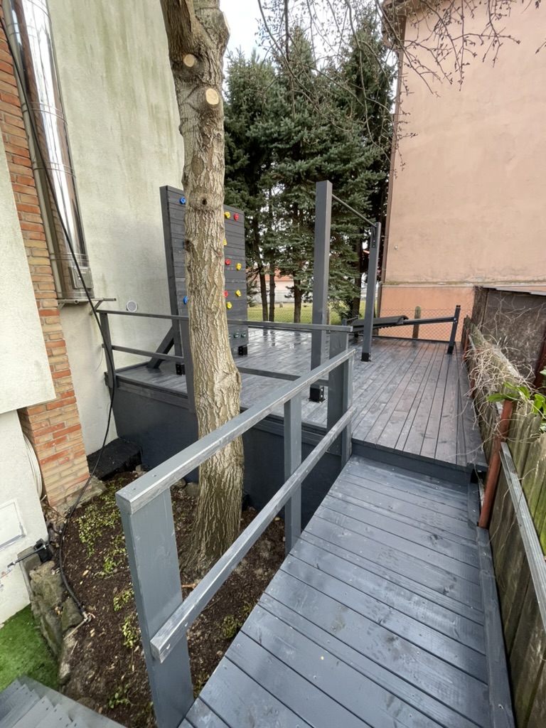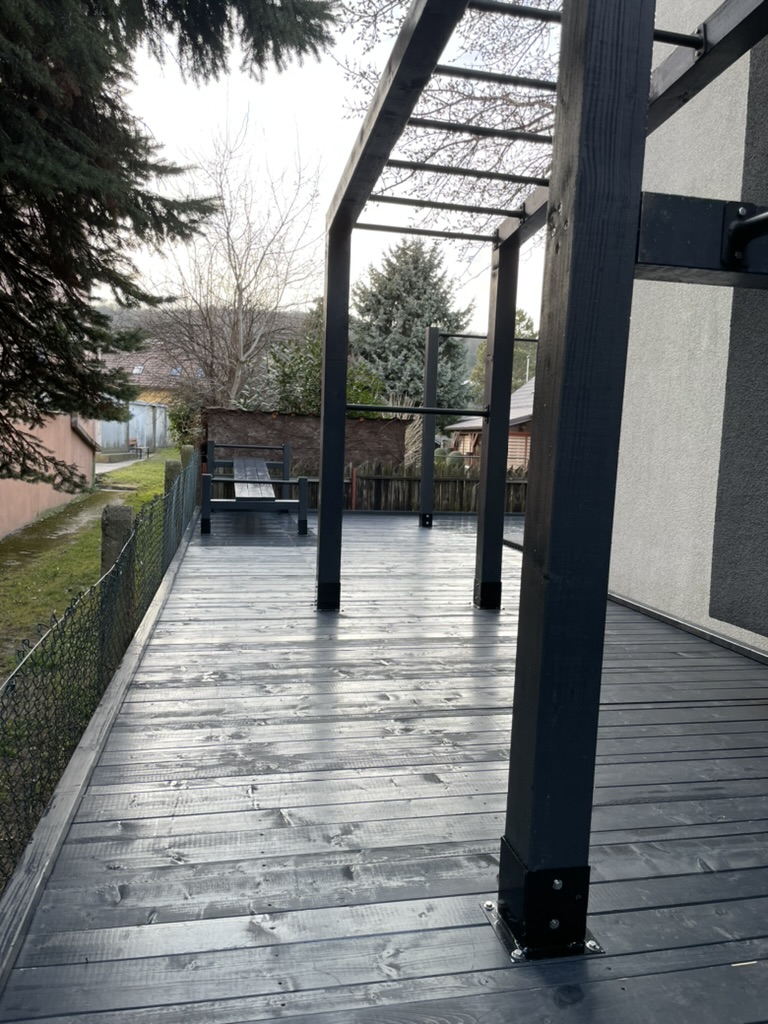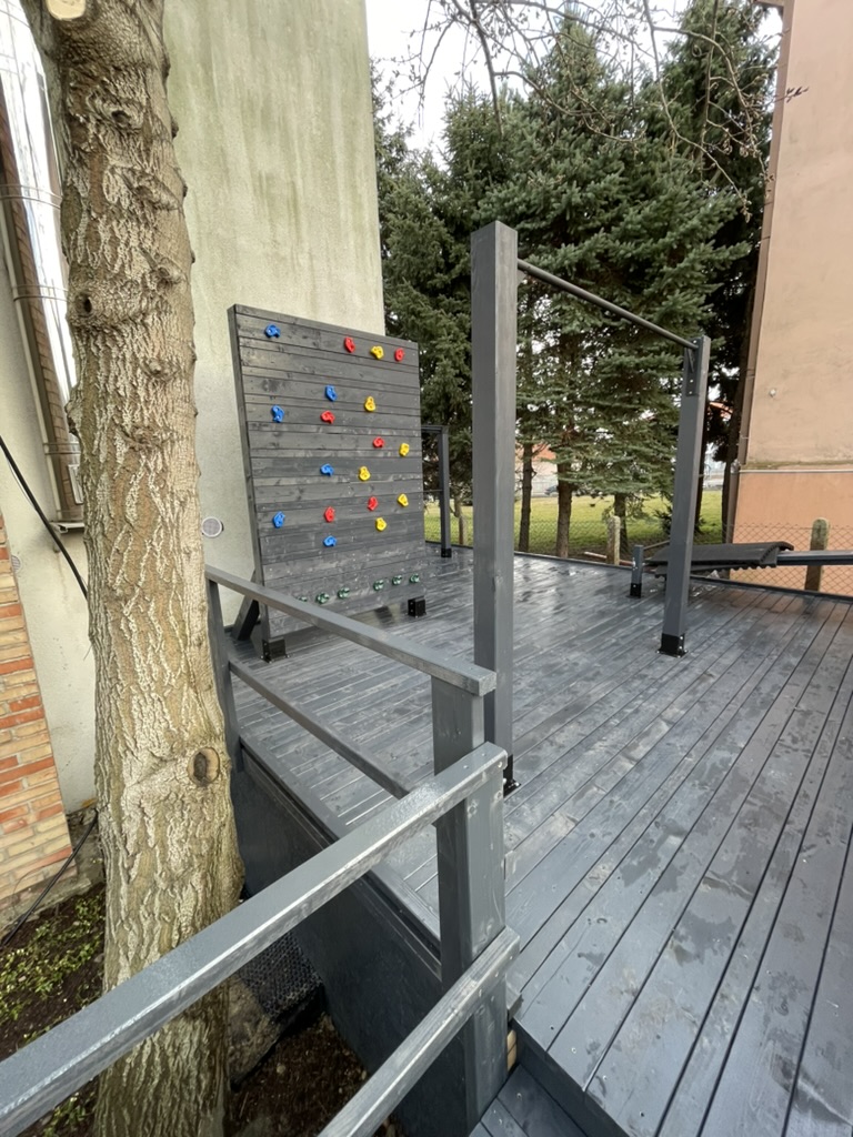 This project was not just about a standard garden design. We also had to design the structure of a wooden platform, on which we then created a workout playground for the homeowners, featuring elements suitable for both children and adults.